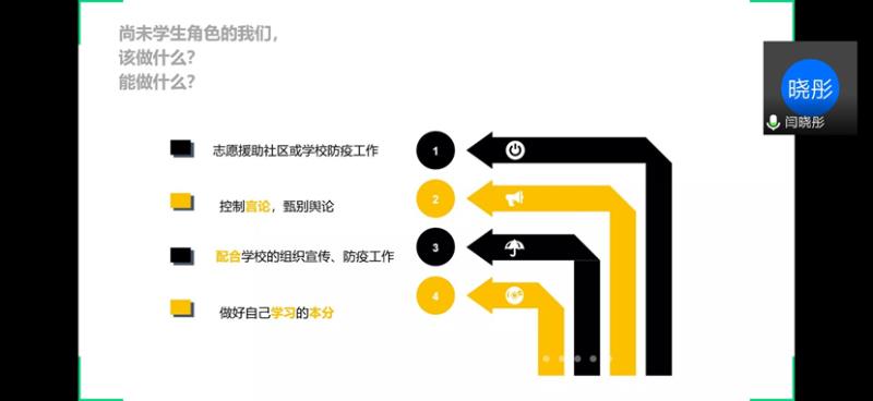 五四青年节前夕,为深入学习习近平总书记给北京大学援鄂医疗队全体“90后”党员的重要回信精神,进一步继承并发扬“五四精神”,学院举办“战‘疫’有我——青春微团课”主题活动,宣传学院青年志愿服务、抗击疫情的先进事迹。粟洨悦、闫晓彤、普月、王琛四位亲身参与抗疫志愿服务的能电学子,分享了服务经历及个人感受。活动依托腾讯会议线上开展,近120位团员参加了活动。