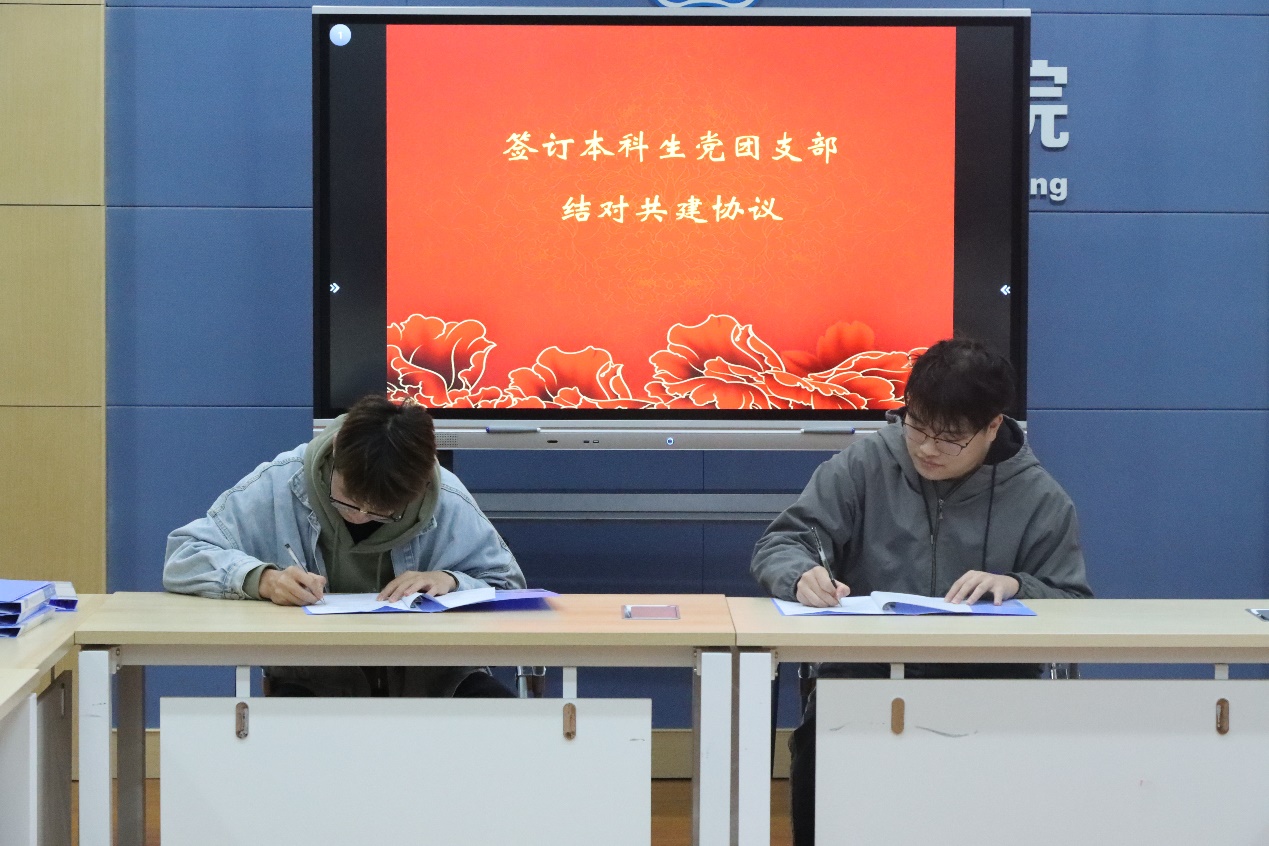 结合党支部团支部组织建制和专业特色方向等实际情况,本科生5个党支部与21级、22级团支部签订结对共建协议书。本科生第四党支部书记陈程老师宣读共建内容,确定结对党团支部每学期至少共同组织1次专题学习会,开展1次主题党日团日活动,开展1次“我为师生做实事”活动。