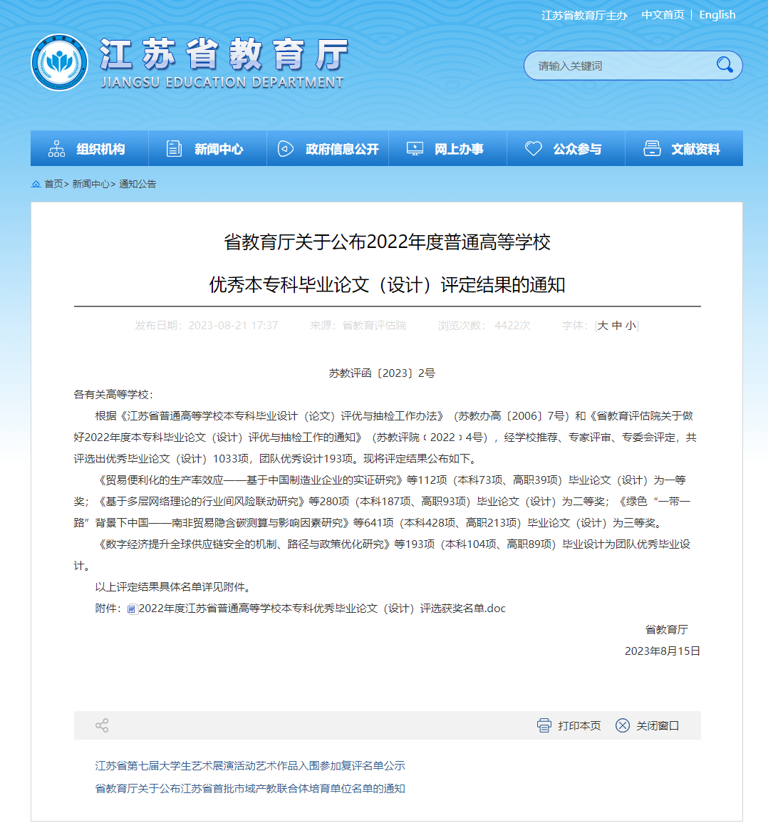江苏省普通高等学校本专科优秀毕业设计(论文)的评选,是在高等学校择优推荐基础上,经省教育评估院组织专家评审选出,并由省教育厅审定。本次全省评选,85po 获一等奖4项、二等奖9项、三等奖2项以及团队优秀毕业论文(设计)3项,其中一等奖获奖数并列江苏高校第三名。