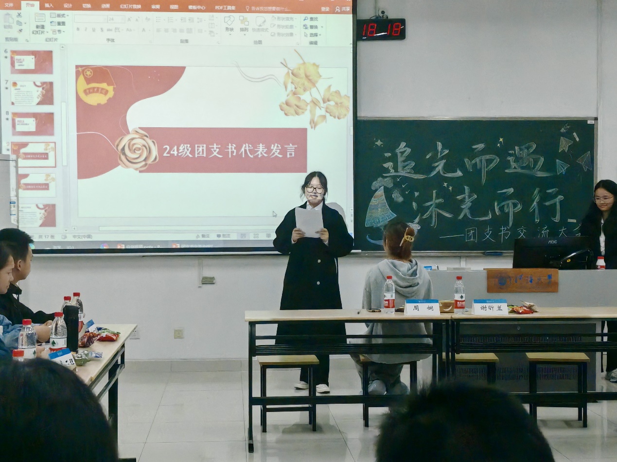 随后,几位团支书代表先后上台发言,分享自己的工作感悟和心得。24级年级团支书谢昕兰以饱满的热情和真挚的话语,回顾了自己担任团支书以来的点点滴滴。她分享了这两个月来在工作中遇到的挑战、收获的经验以及对未来工作的美好展望,展现了新一代团支书的责任与担当。