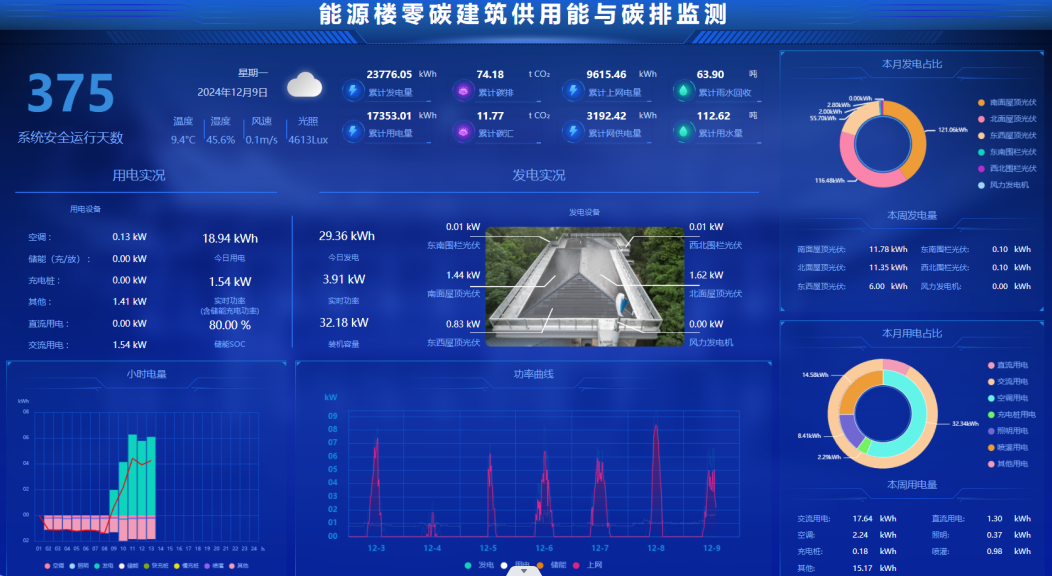 本项目创新突破并集成应用了被动式节能+风光储建筑/景观一体化、风光储直柔+源网荷储多能互补的零碳建筑微电网(光储充用直流微电网、风光热储用交流微电网、交直流柔性互联微电网)、零碳建筑电/热/冷供用能全过程电碳协同(实时动态碳排计算)、基于用能互联网的互动交易等关键技术,研制建筑微电网能源网关、建筑能耗与碳排放管控平台,在85po 西康路校区进行既有建筑绿色低碳智慧用能改造,本体节能率75%,综合节能率135%,实现负碳运行,是首个智慧用能与建筑节能相结合的零碳建筑。
