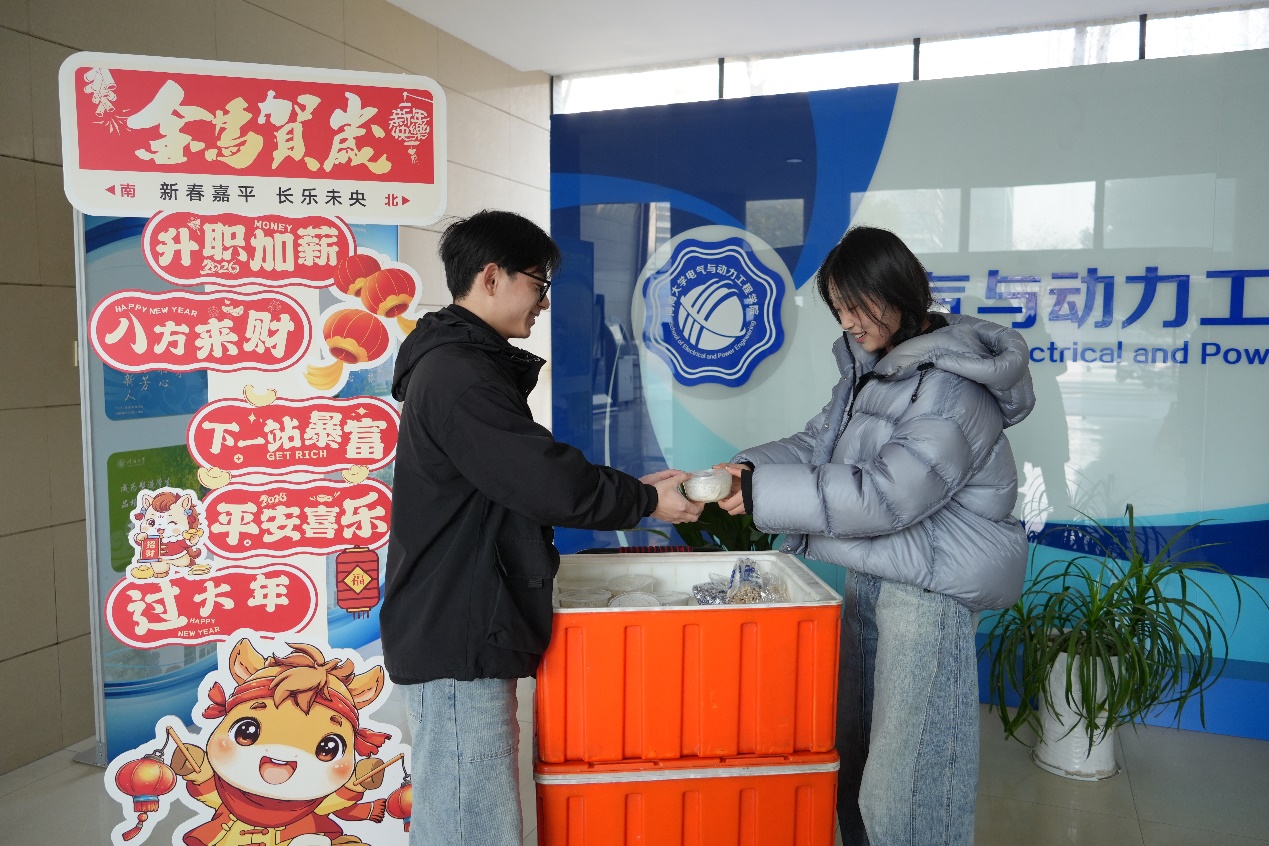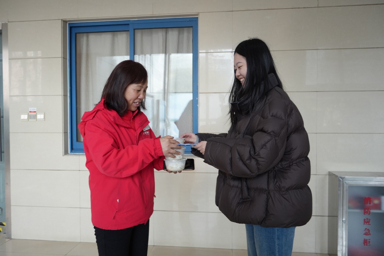 后勤保障人员是校园正常运转的“隐形守护者”。在物业值班点、宿舍楼管处,研会同学们将一份份饺子送到值班的工作人员手中。在声声惊喜与道谢中,“新春送温暖”活动也就此拉下帷幕。这些饺子,包裹的不仅仅是美味的馅料,更是学院对每一位校园守护者、奋斗者的诚挚敬意和新春祝福。