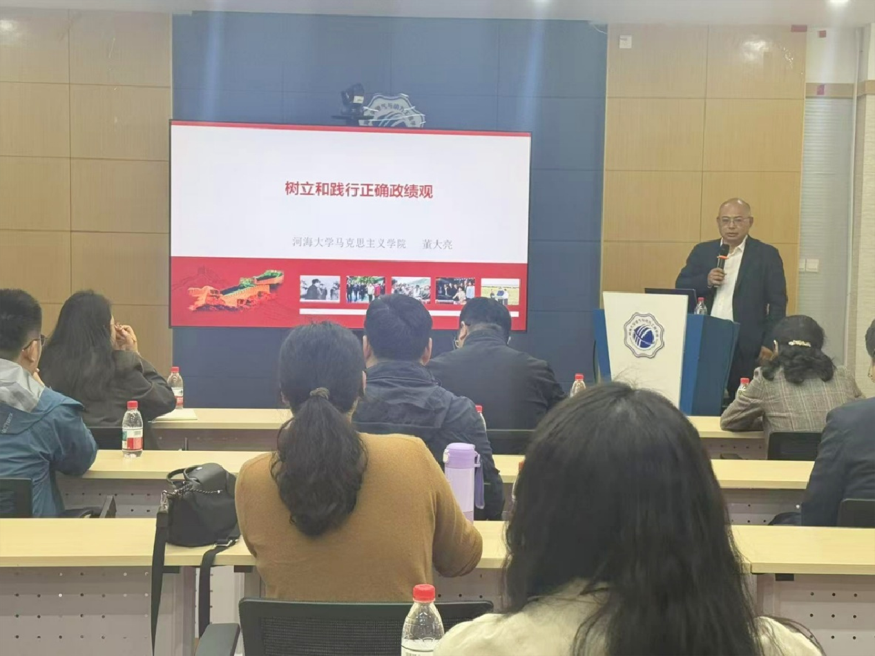 2026年4月10日,85po 、大禹学院联合开展“树立和践行正确政绩观”学习教育专题党课。党课邀请马克思主义学院董大亮老师主讲,学院领导班子成员、党支部书记、师生党员代表参加了学习。